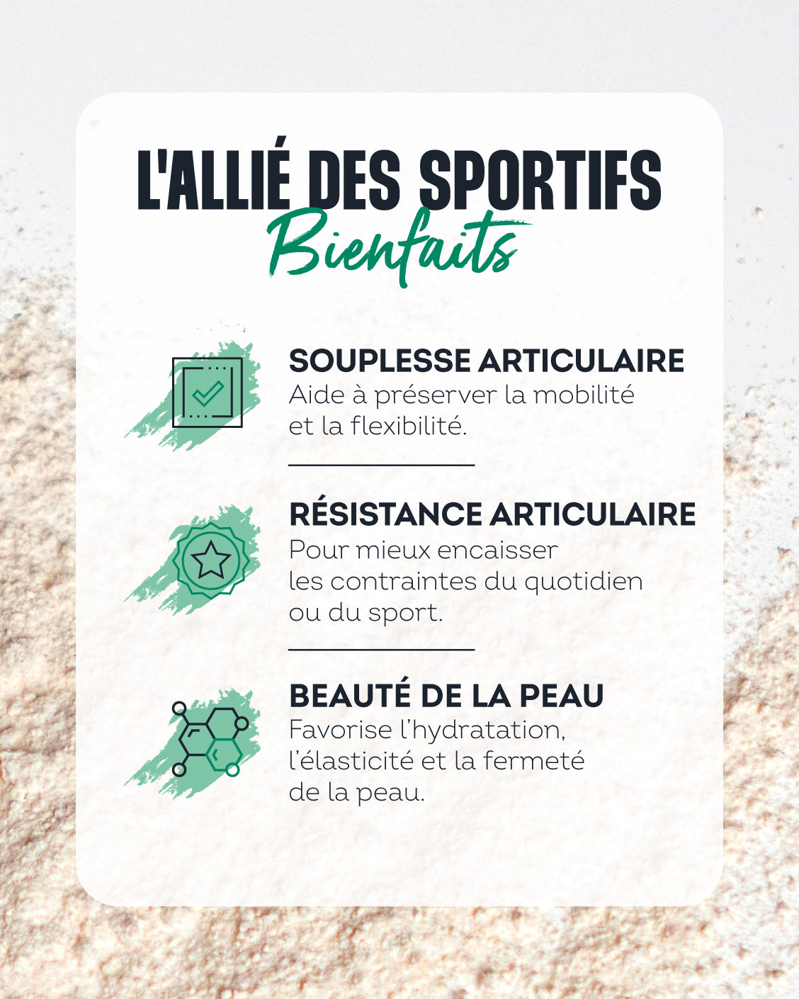 Son bas poids moléculaire favorise une meilleure assimilation, limite l’inconfort articulaire post-entraînement et aide à prévenir les blessures liées à la répétition des mouvements.