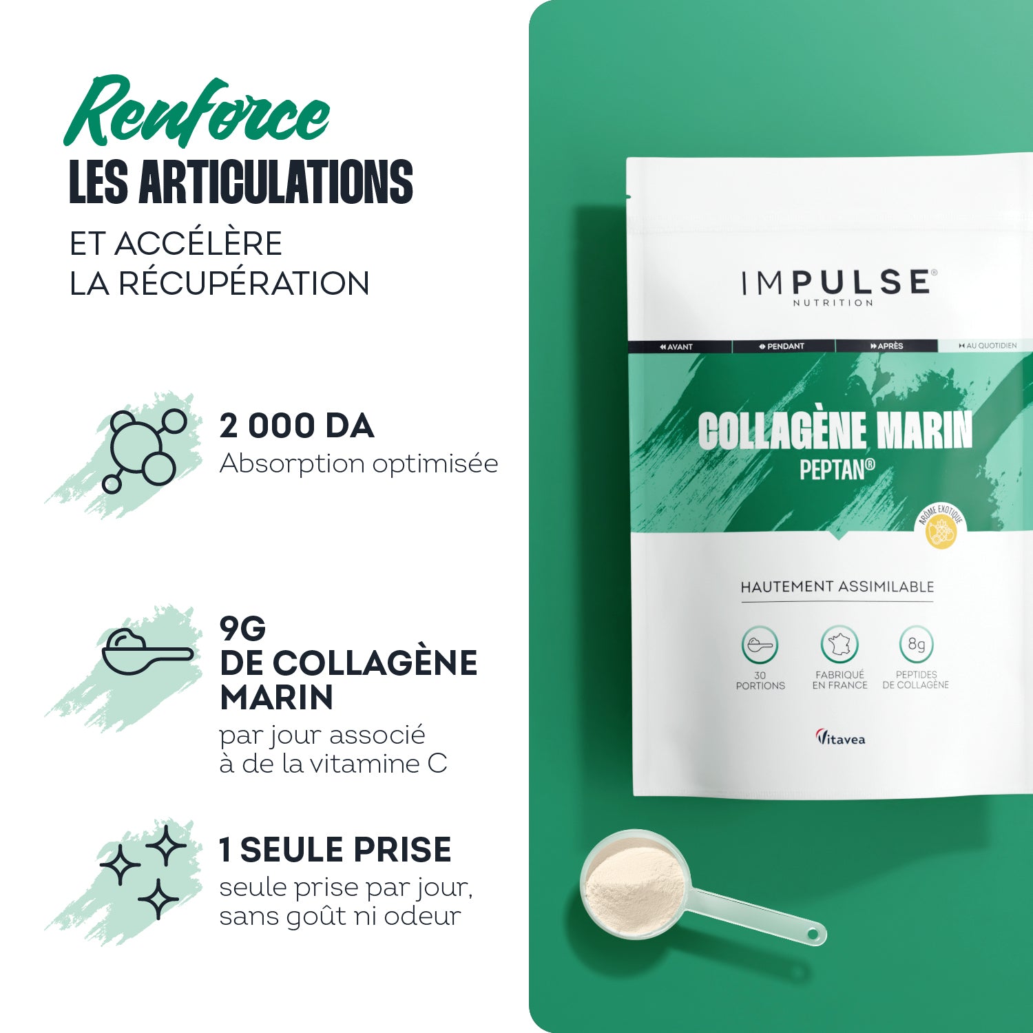 Le COLLAGÈNE MARIN IMPULSE NUTRITION, breveté Peptan®, est votre allié pour soutenir vos articulations, votre récupération et la jeunesse de votre peau.