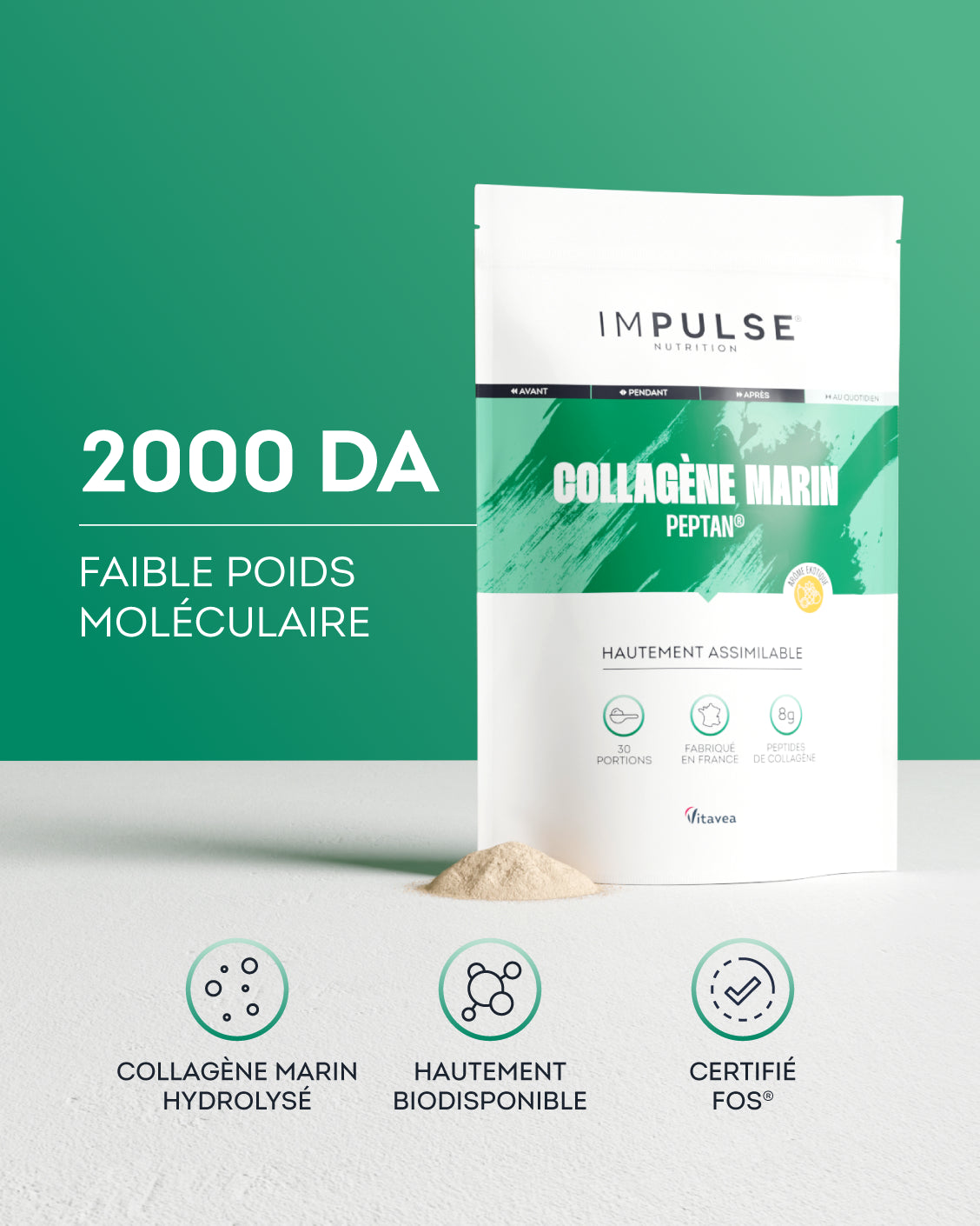 Issu de sources marines, il est hydrolysé pour offrir une haute assimilation grâce à son faible poids moléculaire – 2000 DA.