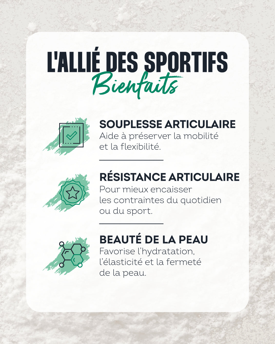 Son bas poids moléculaire favorise une meilleure assimilation, limite l’inconfort articulaire post-entraînement et aide à prévenir les blessures liées à la répétition des mouvements.