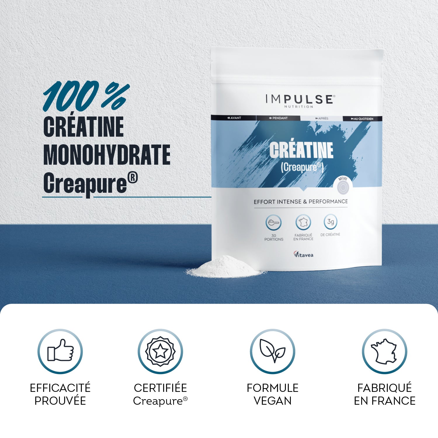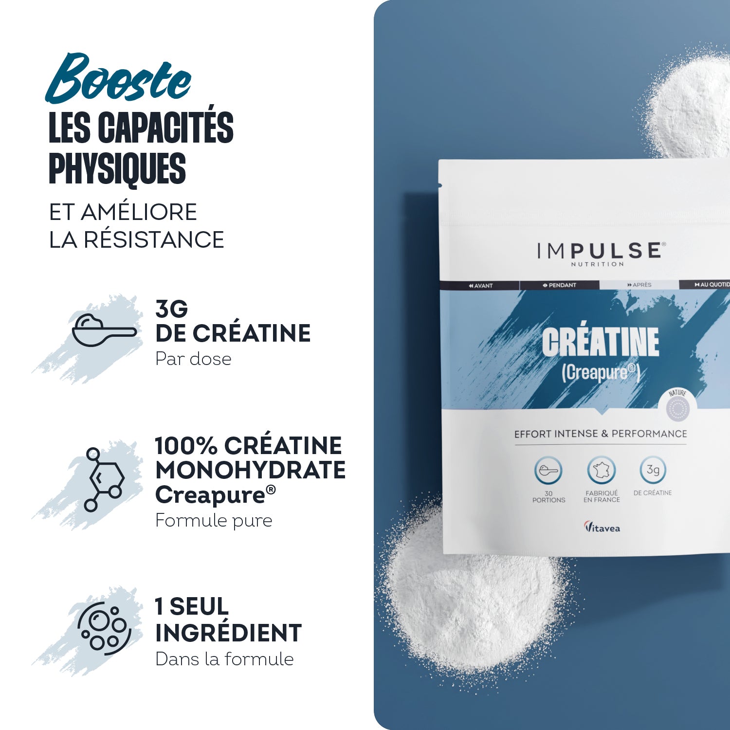 La CRÉATINE IMPULSE NUTRITION, certifiée Creapure®, est votre alliée pour booster vos capacités physiques et améliorer votre résistance à l’effort, même intense.