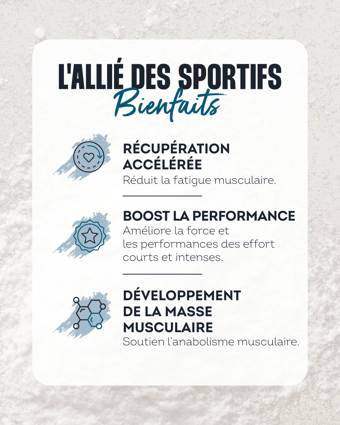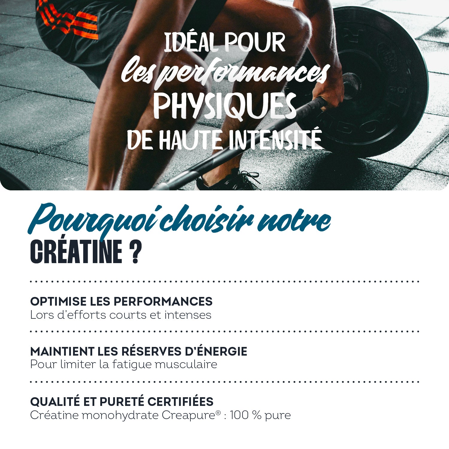 Naturellement présente dans votre corps, la créatine est issue de trois acides aminés clés : l’arginine, la glycine et la méthionine. Elle est idéale si vous cherchez à améliorer vos performances, à repousser vos limites lors d’efforts intenses et de courte durée, tout en favorisant la prise de force.