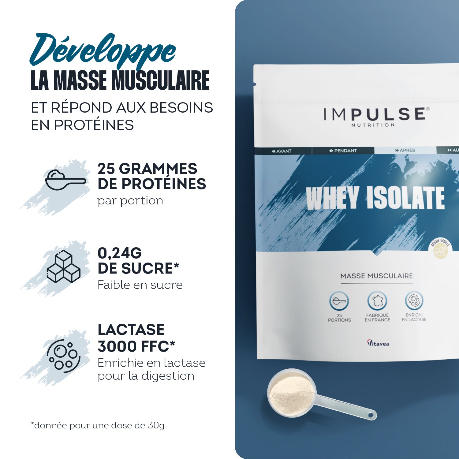 La WHEY ISOLATE IMPULSE NUTRITION est votre alliée pour développer votre masse musculaire et répondre à vos besoins en protéines. Une formule puissante, pure, pour des résultats visibles.