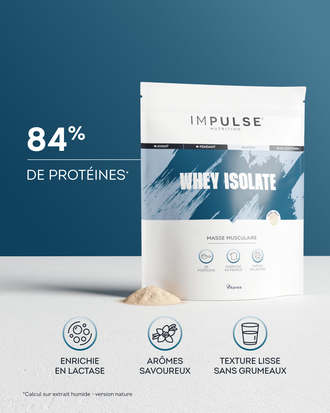 Enrichie en lactase, l’enzyme qui dégrade naturellement le lactose, la WHEY ISOLATE IMPULSE NUTRITION est mieux tolérée, même par les personnes sensibles. Résultat : une absorption rapide des protéines, sans inconfort digestif, pour une efficacité maximale après l’entraînement.